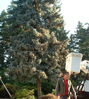 Here's a nearly "after" shot. It was really interesting to watch the lumberjacks trim all the branches off first, then drop down the pieces of the trunk. They were really fast too!